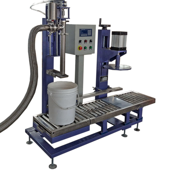 全自動灌裝壓蓋線工作流程:人工放桶-自動滾筒輸送-自動定位-自動稱重灌裝-自動滾筒輸送。